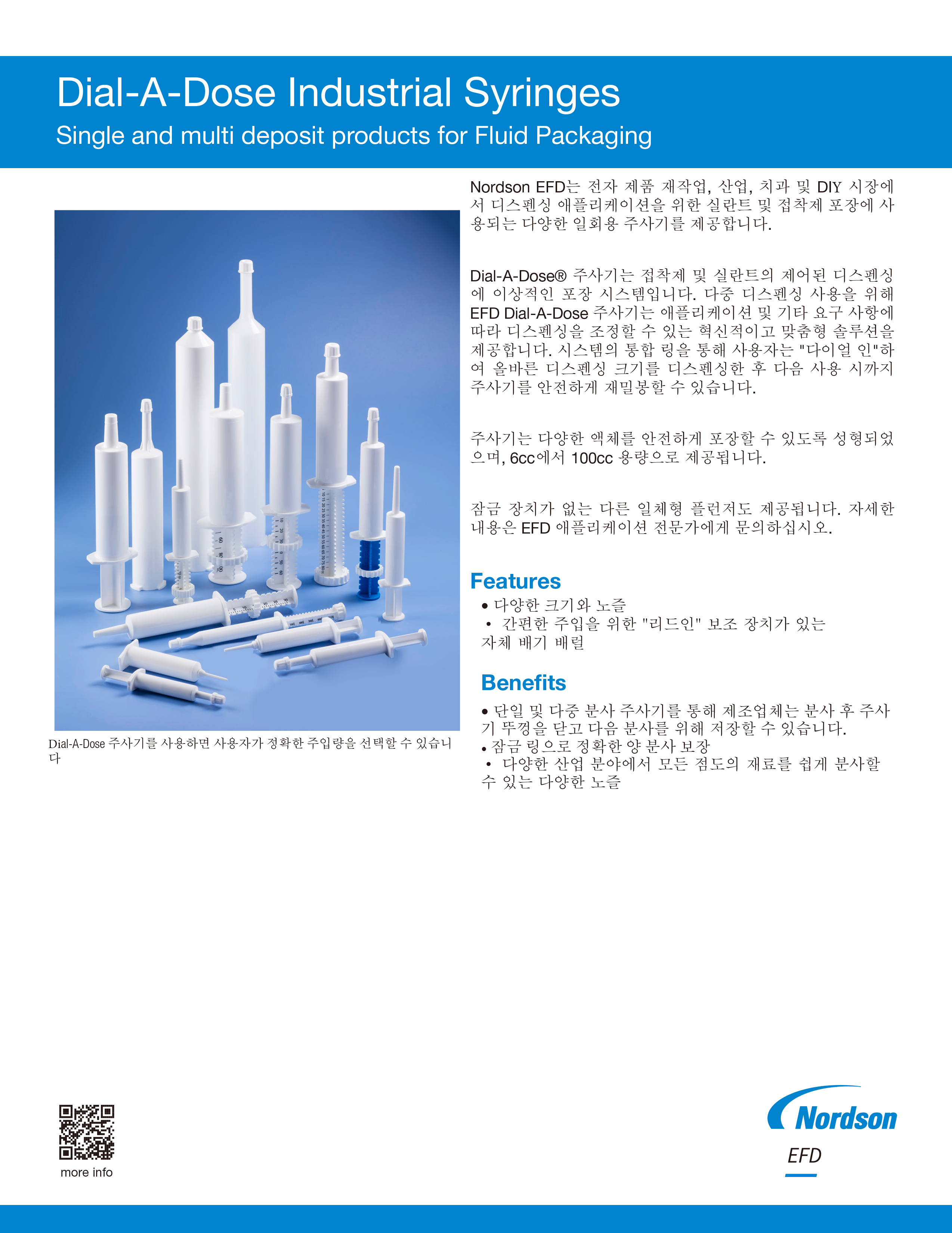 Dial-A-Dose® 주사기는 접착제 및 실란트의 제어된 디스펜싱에 이상적인 포장 시스템입니다. 다중 디스펜싱 사용을 위해 EFD Dial-A-Dose 주사기는 애플리케이션 및 기타 요구 사항에 따라 디스펜싱을 조정할 수 있는 혁신적이고 맞춤형 솔루션을 제공합니다. 시스템의 통합 링을 통해 사용자는 "다이얼 인"하여 올바른 디스펜싱 크기를 디스펜싱한 후 다음 사용 시까지 주사기를 안전하게 재밀봉할 수 있습니다.